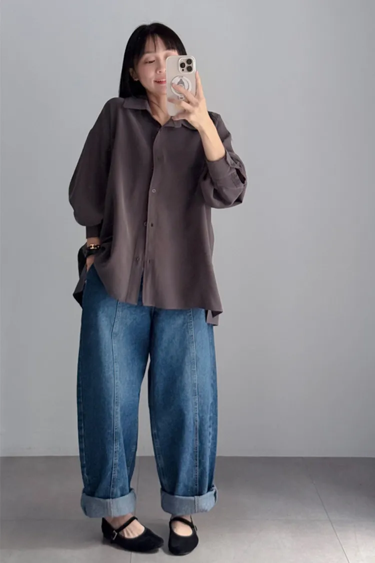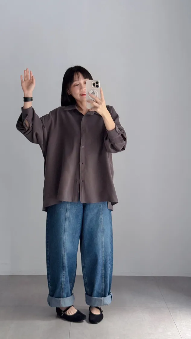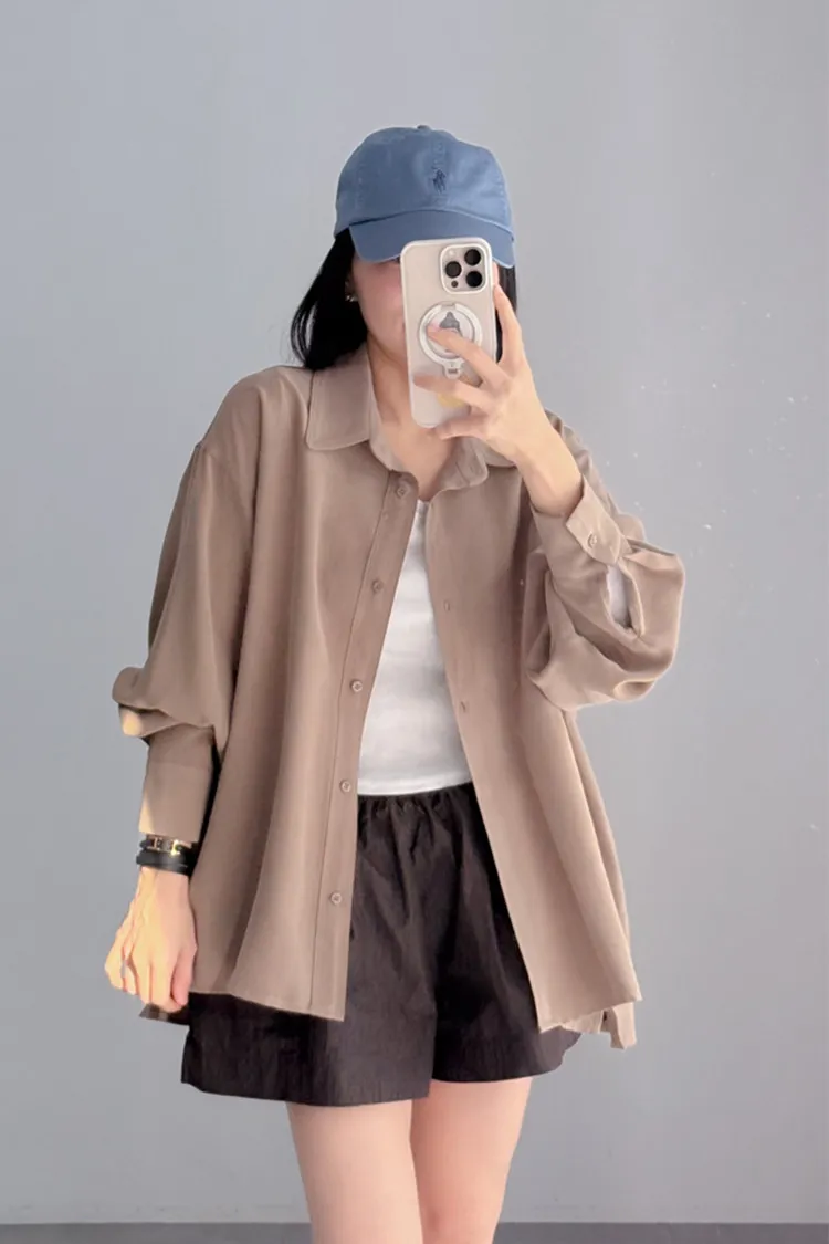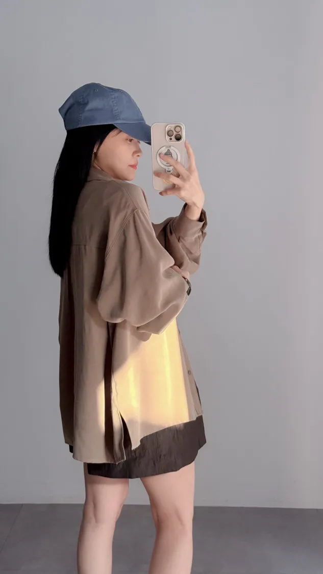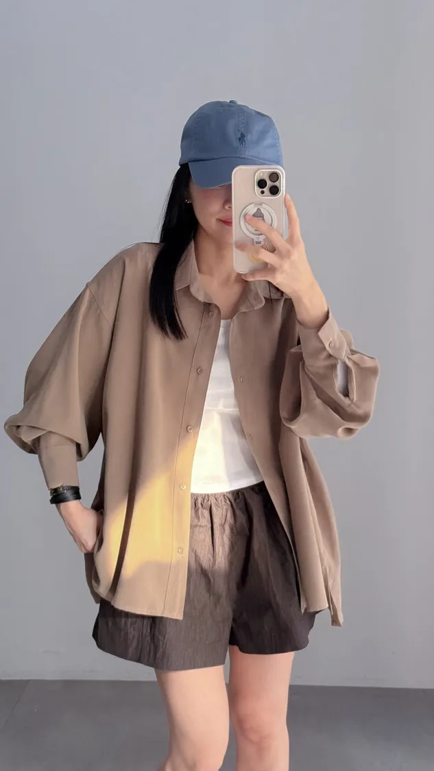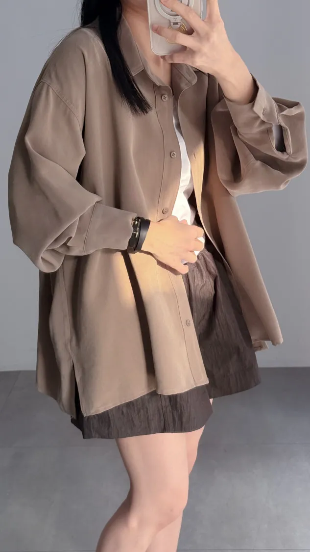 [成份] 嫘縈95%、聚酯纖維5%[特點] 表面細緻柔滑、帶霧面質感,經典襯衫領設計,風格俐落耐看,下擺微弧型剪裁,可紮可放。[洗滌建議] 衣料含嫘縈成份,該材質在水中強度會變弱,為避免縮水,建議乾洗。