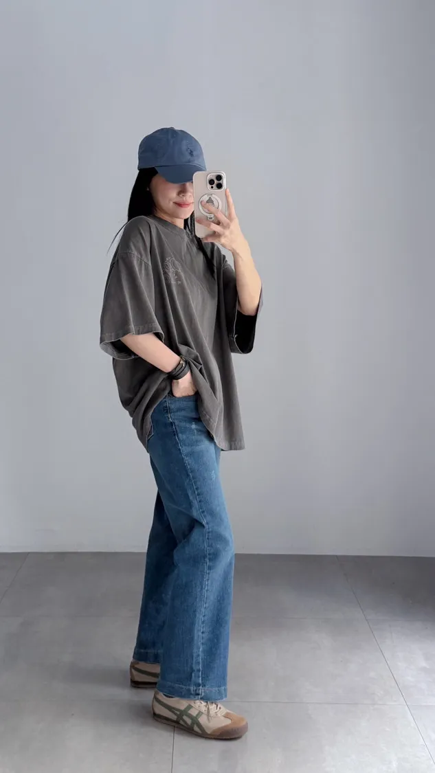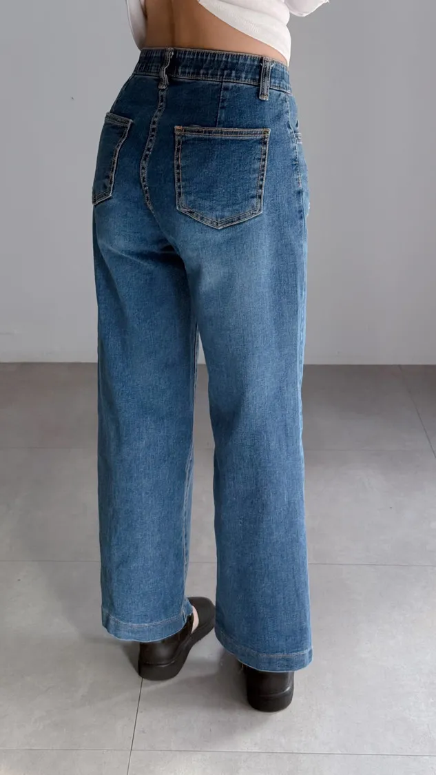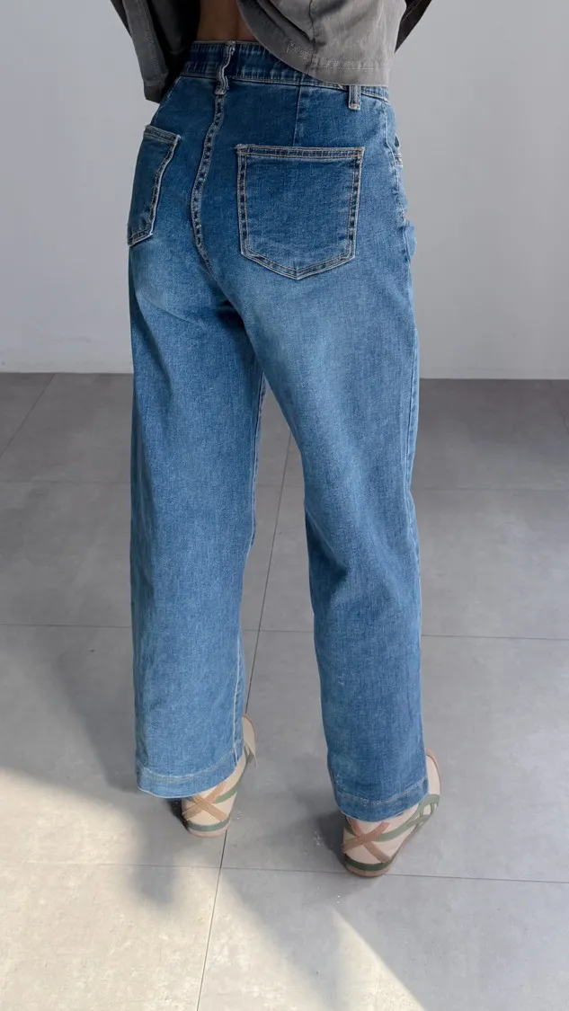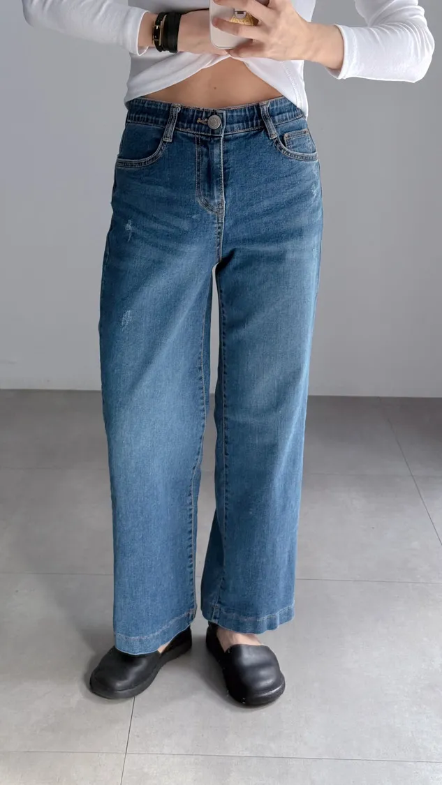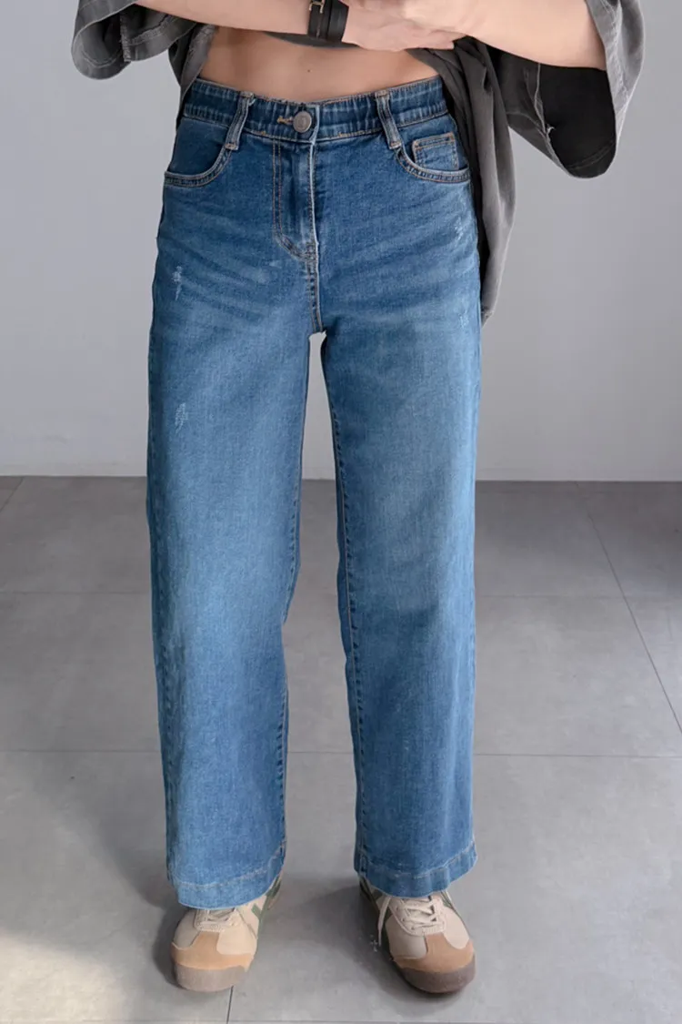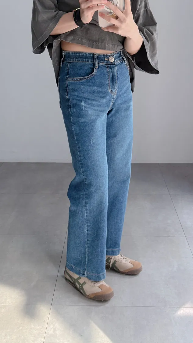 [特點] 內鬆緊彈性腰圍,修身直筒剪裁自然修飾腿型,中藍水洗刷色,彈性布料。