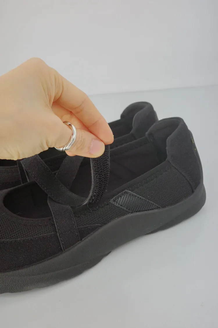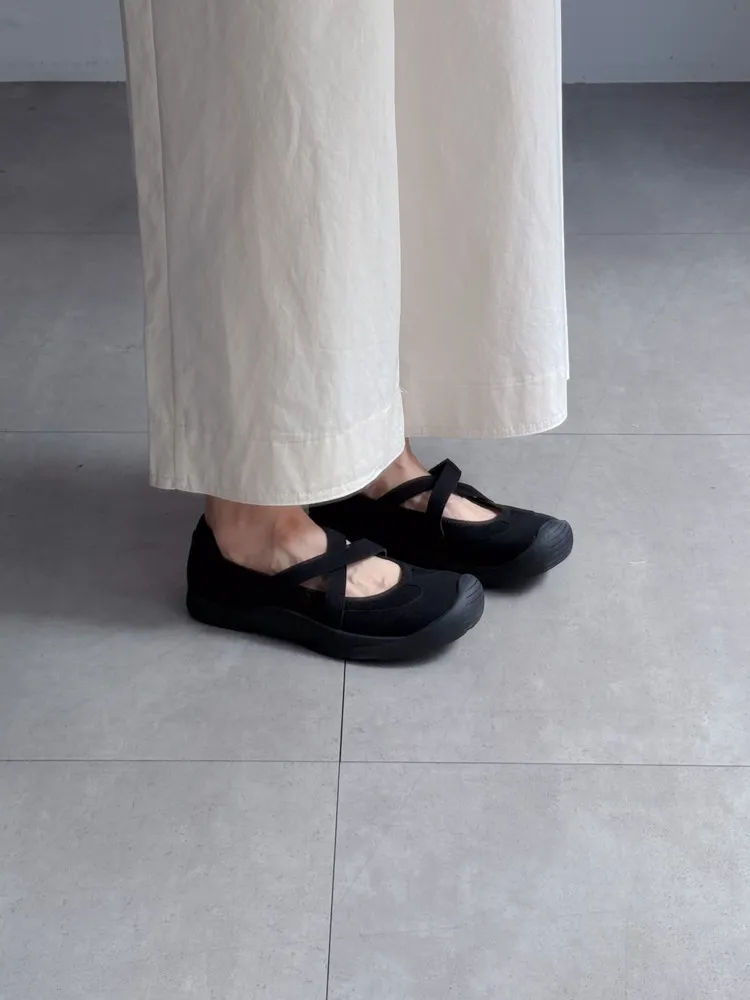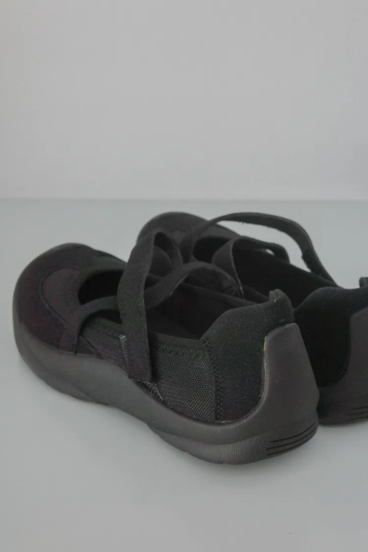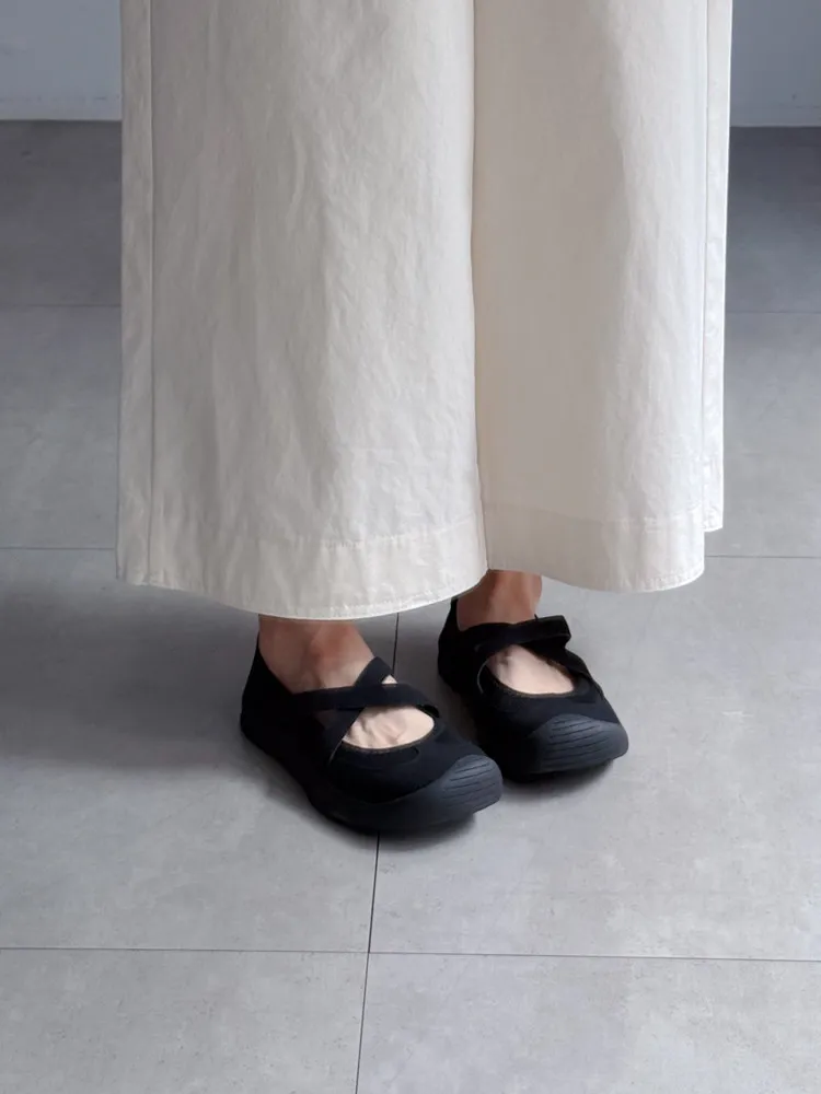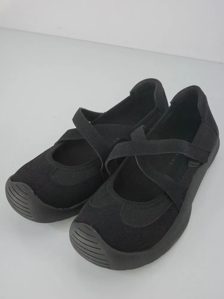 [成份] 聚酯纖維95%、彈性纖維5% [特點] 彈性布面+橡膠鞋底,結合芭蕾舞鞋與休閒鞋概念的交叉平底鞋,鞋面具有彈性與包覆性,輕量不厚重,魔鬼氈方便穿脫。闆娘腳長22.5cm 這雙穿23號沒有穿襪穿還有一指空間