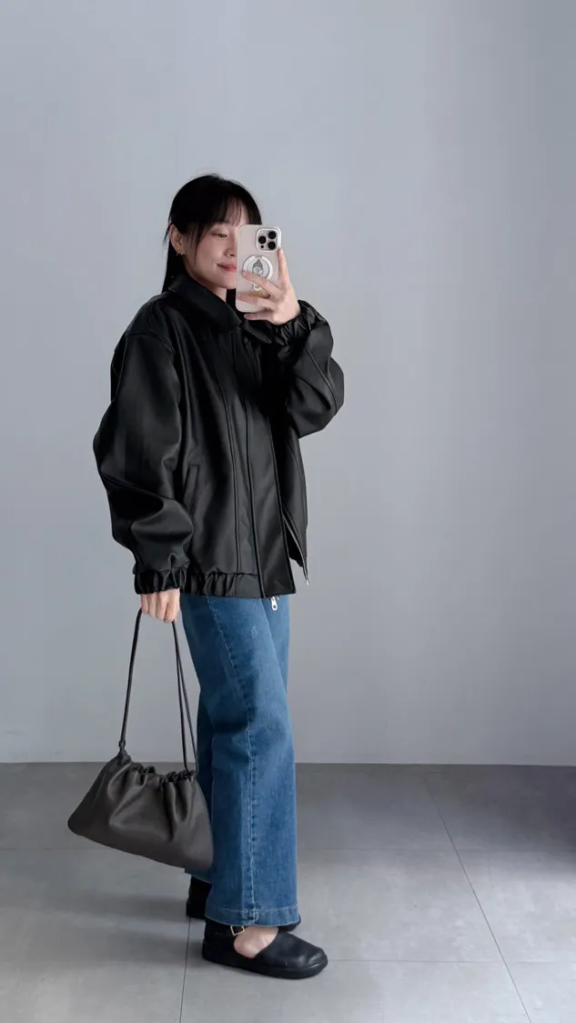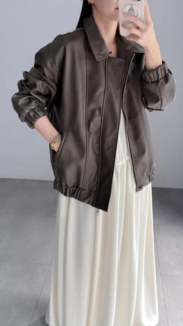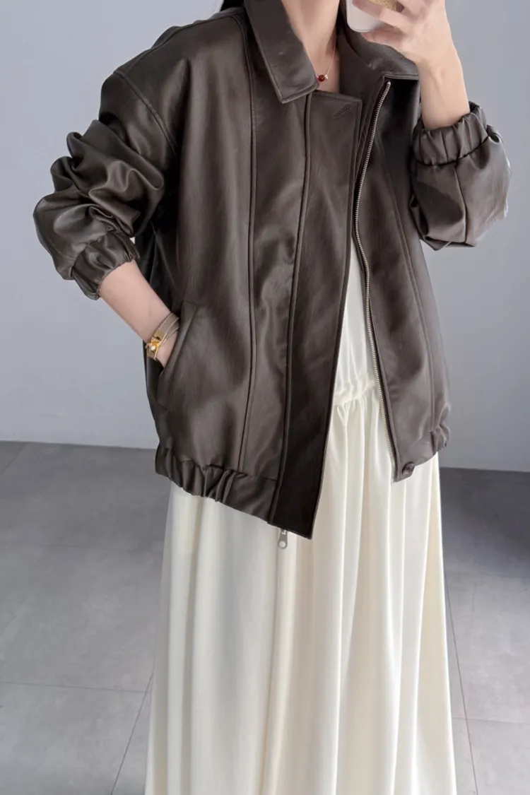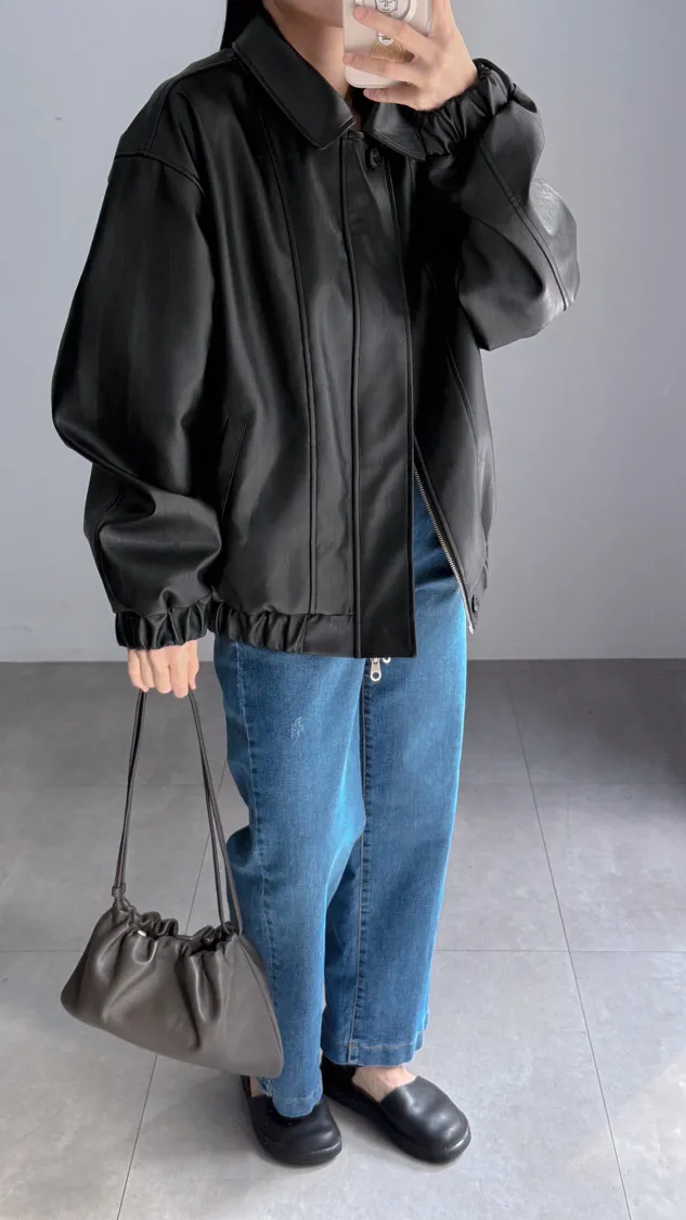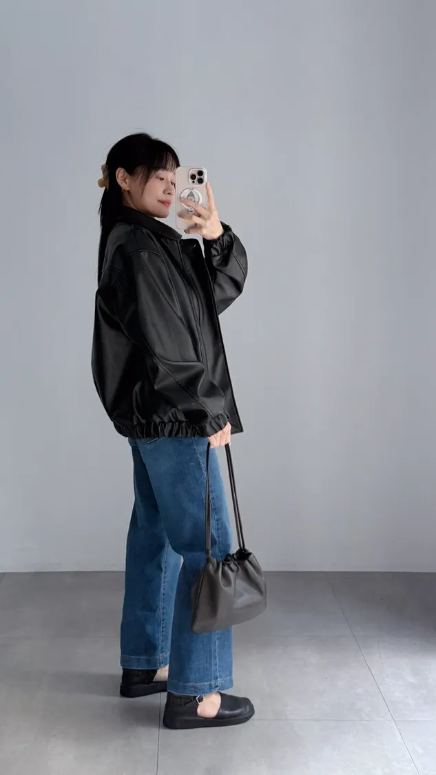 [特點] 小領設計,霧光感皮革面料,雙拉鍊+上下單釦穿脫,手袖+下擺彈性縮口造型。