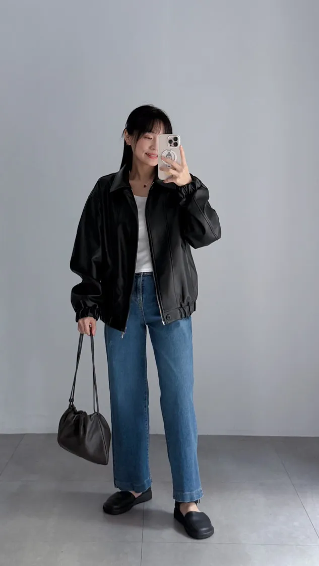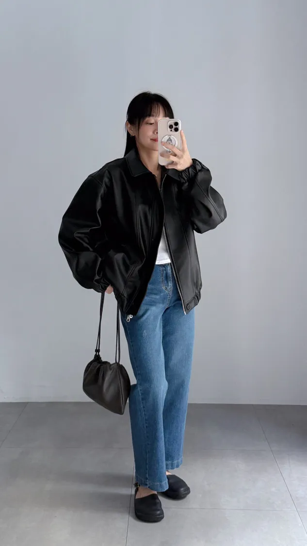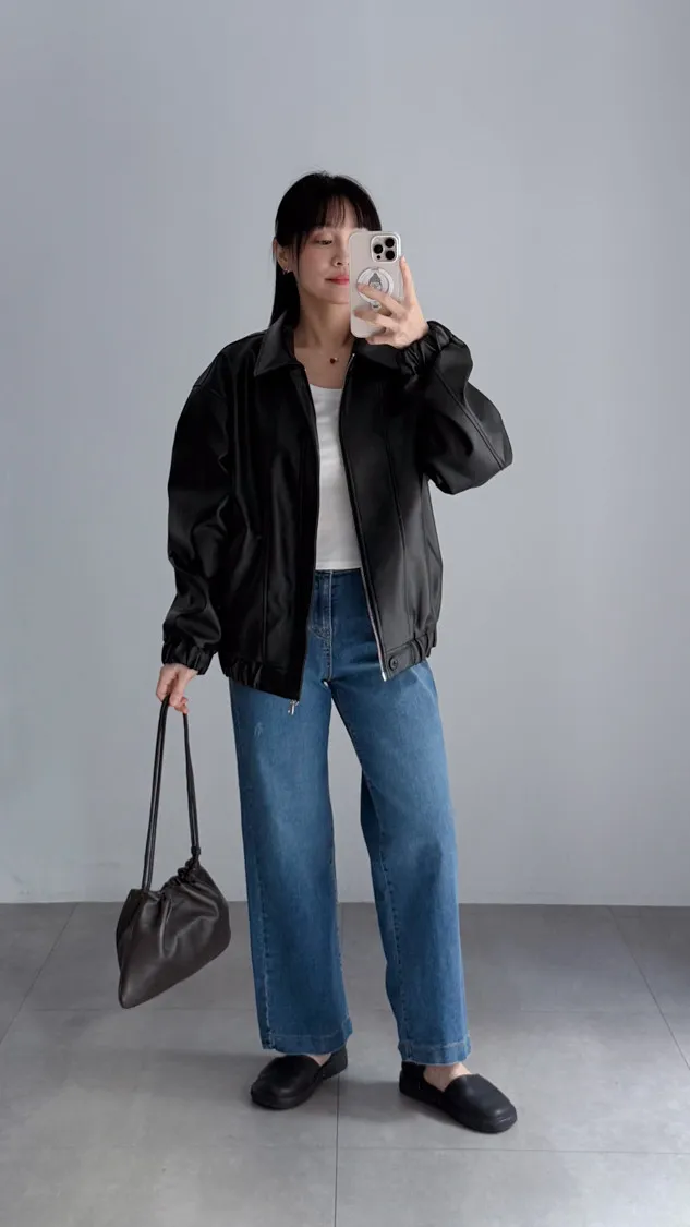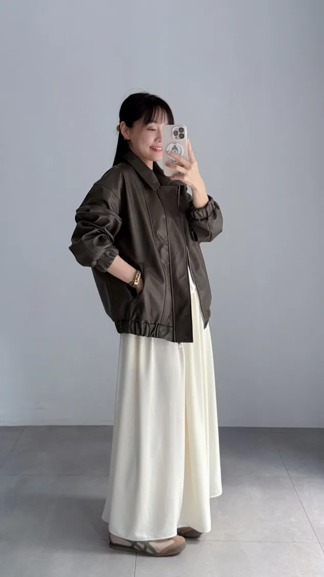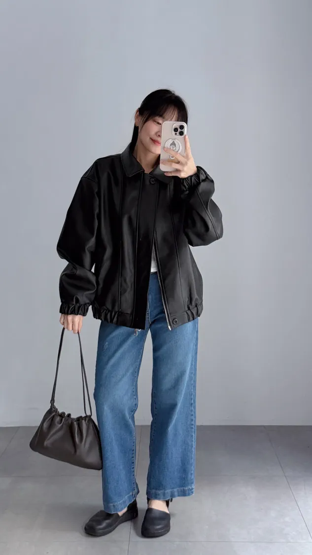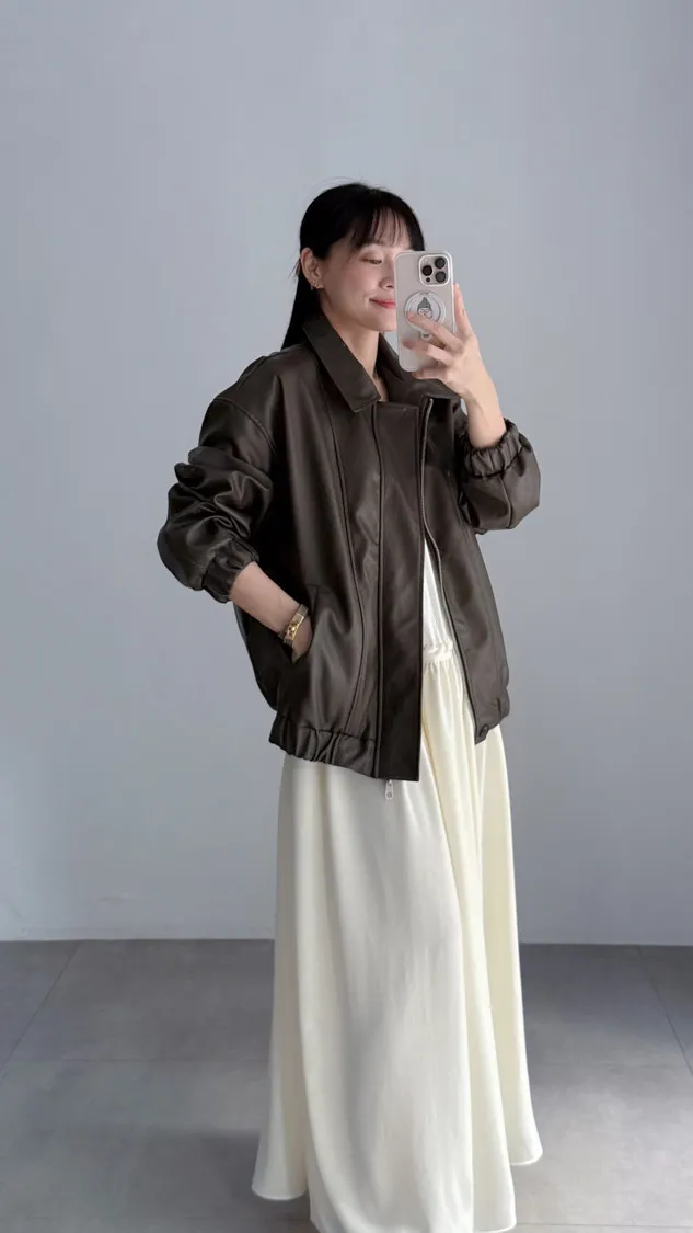 [特點] 小領設計,霧光感皮革面料,雙拉鍊+上下單釦穿脫,手袖+下擺彈性縮口造型。