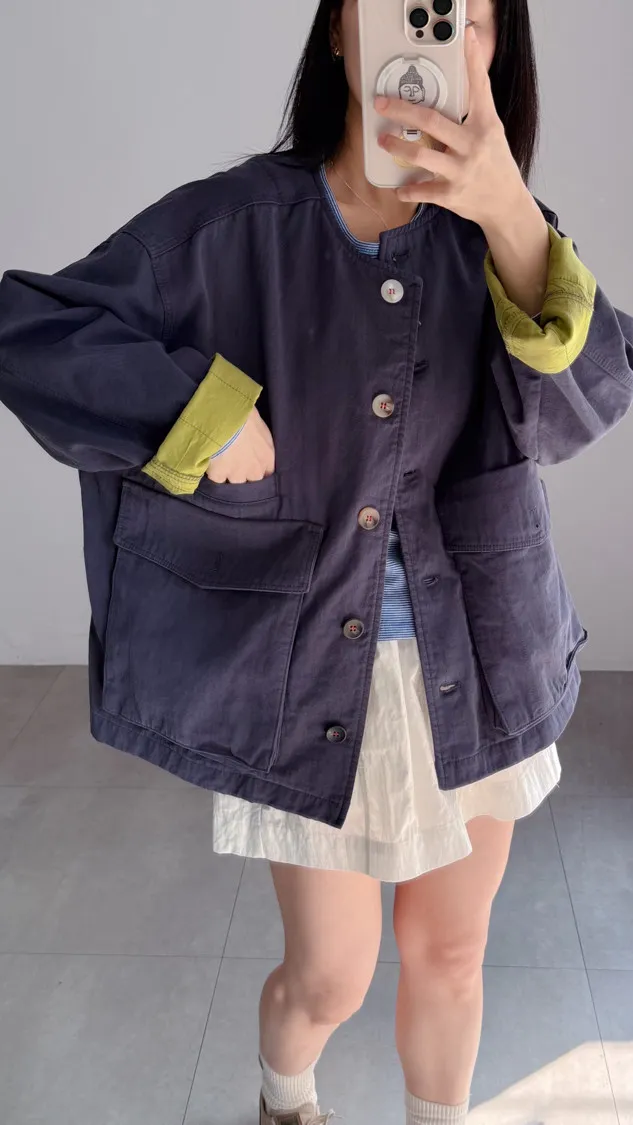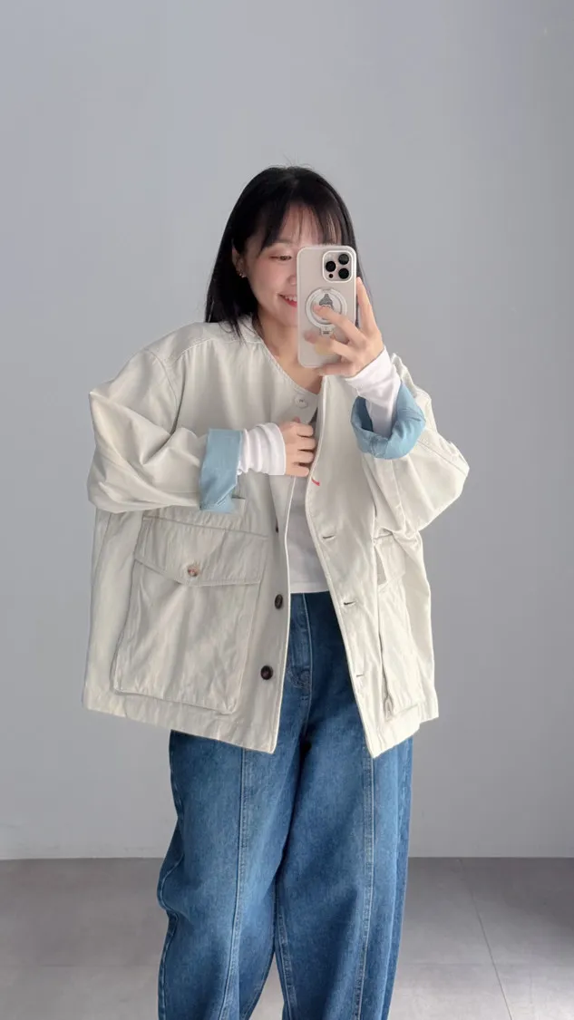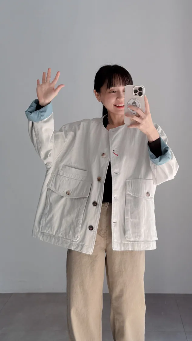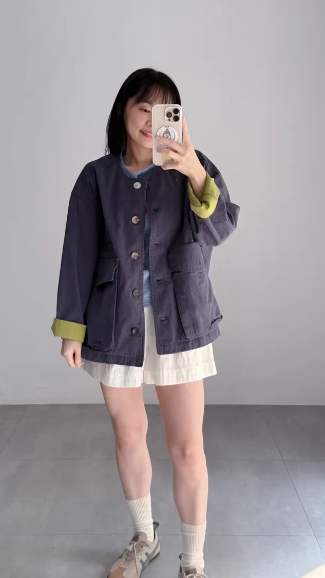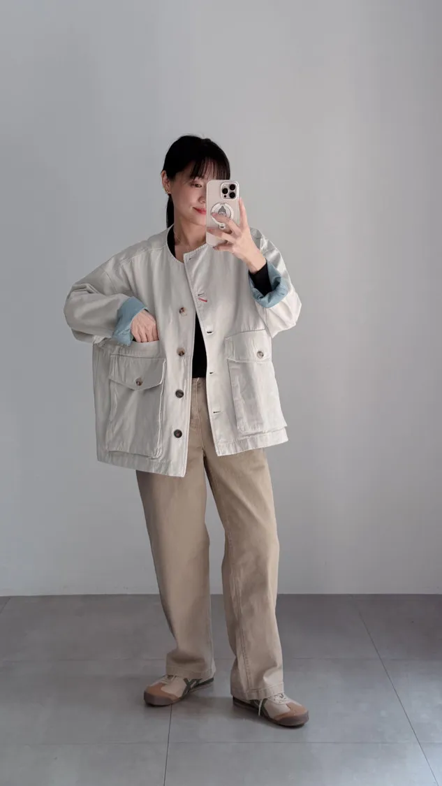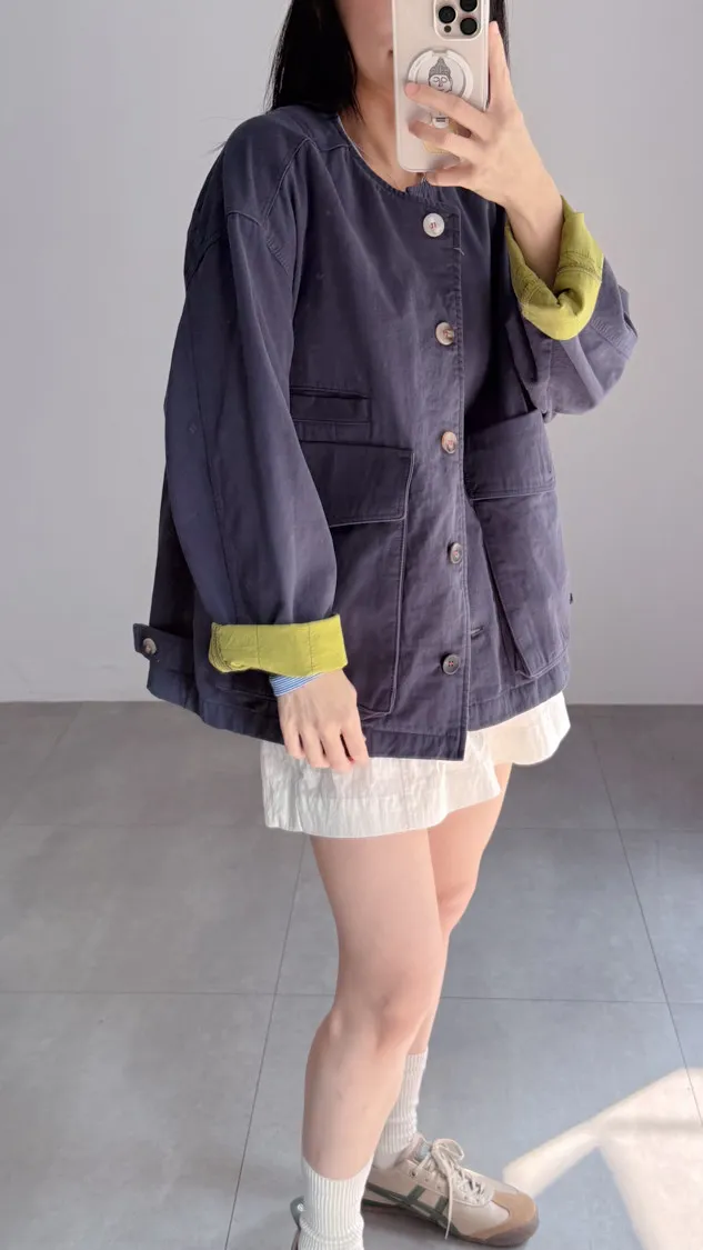 [特點] 無領外套設計,布面直線車縫細節,增加立體紋理,棉感布料,微寬鬆剪裁,內裡異色拼接,雙口大口袋設計。