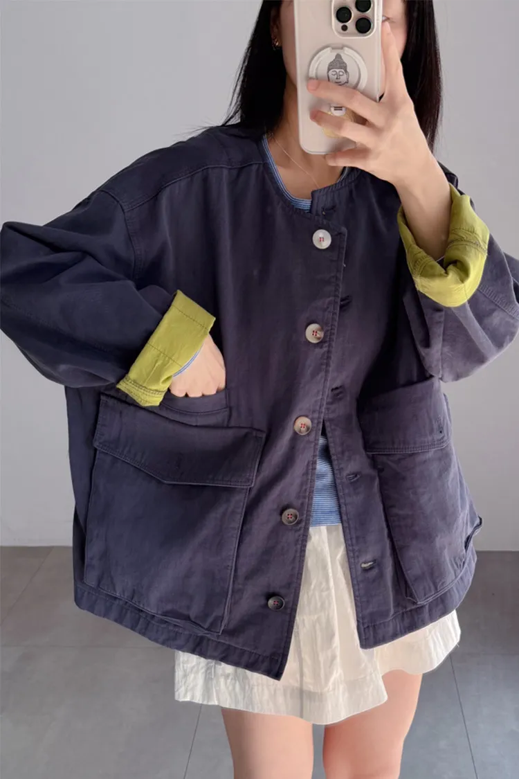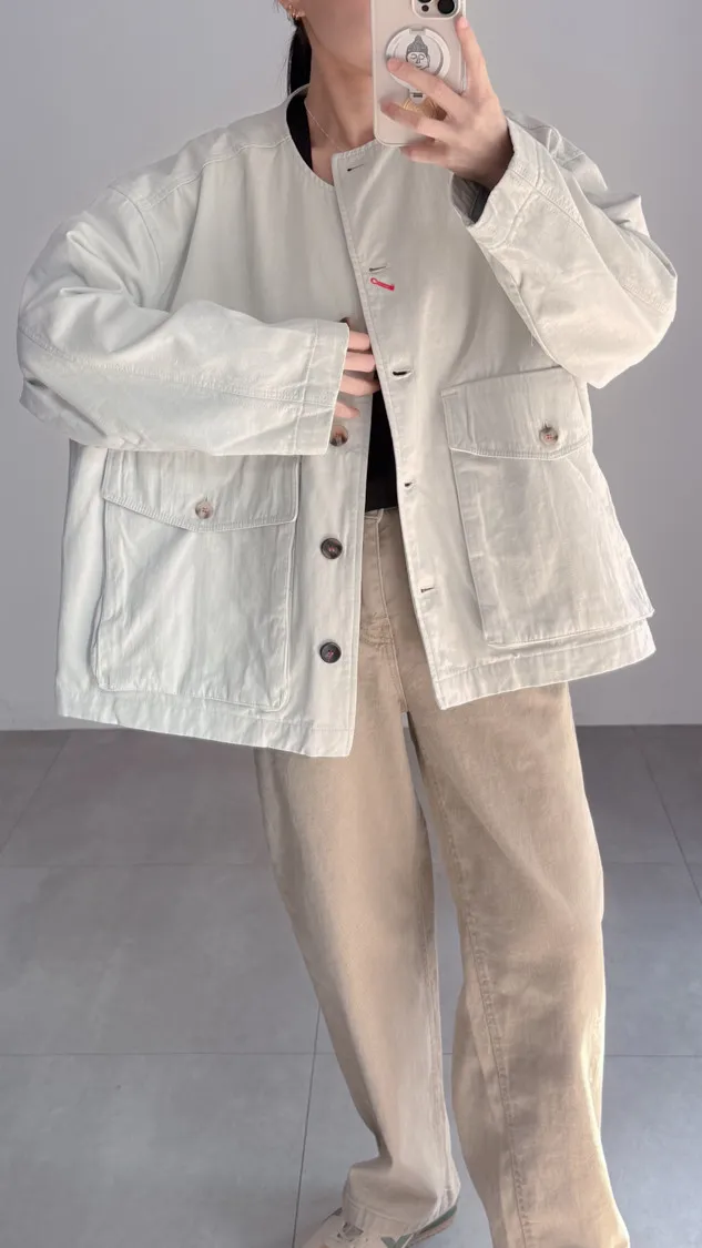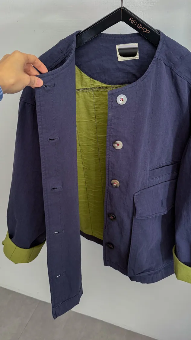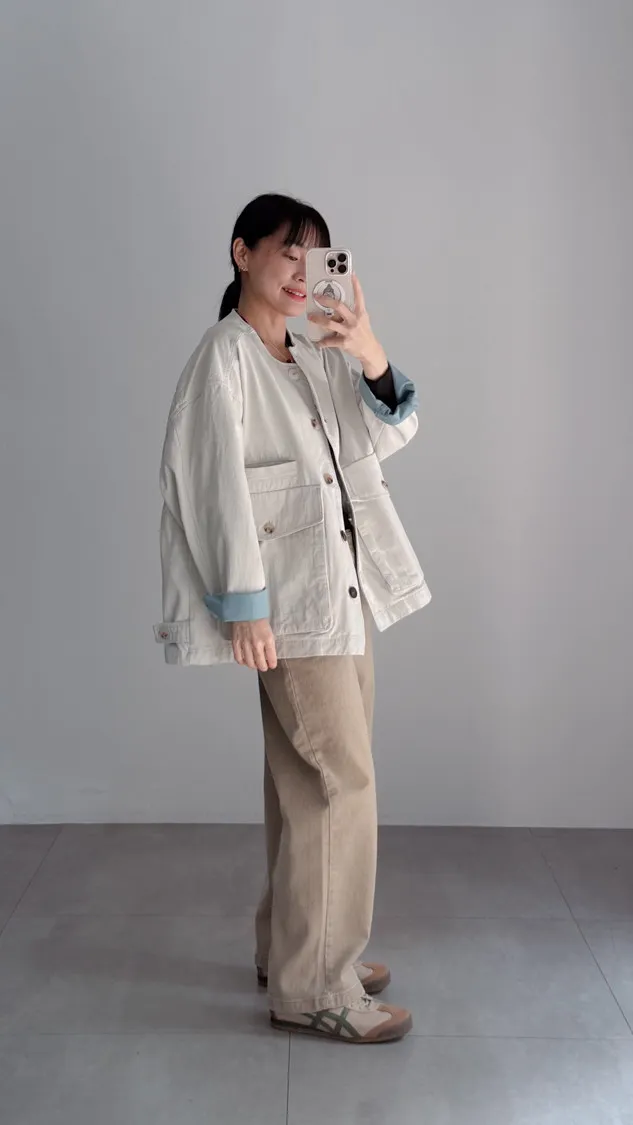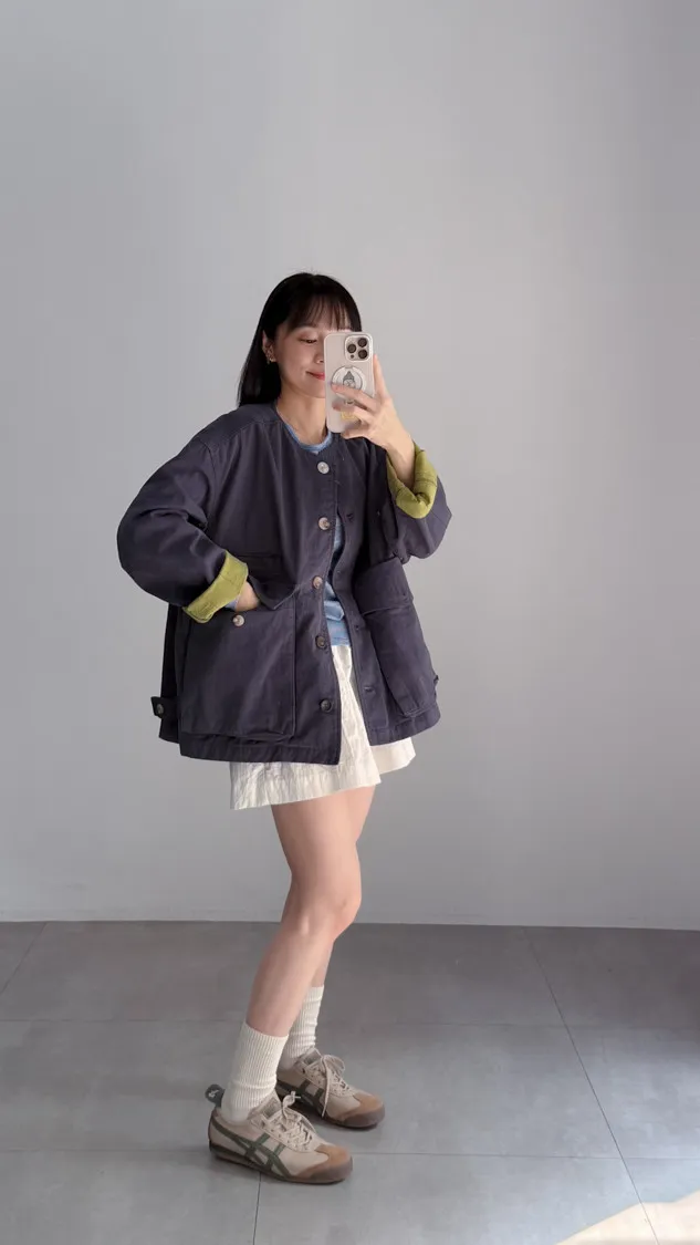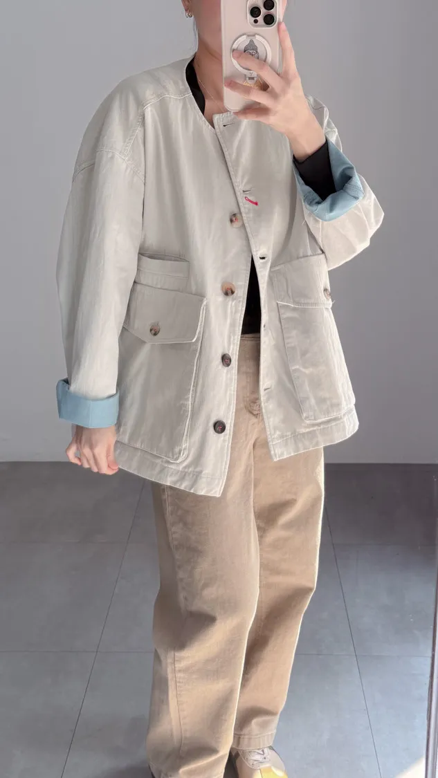 [特點] 無領外套設計,布面直線車縫細節,增加立體紋理,棉感布料,微寬鬆剪裁,內裡異色拼接,雙口大口袋設計。