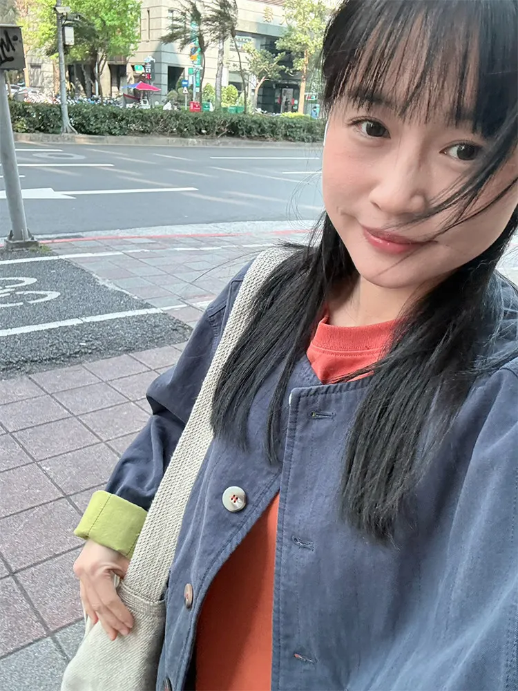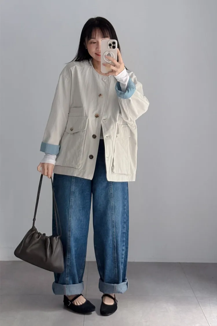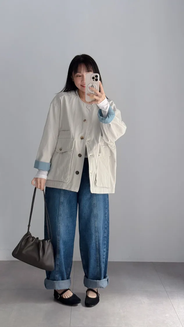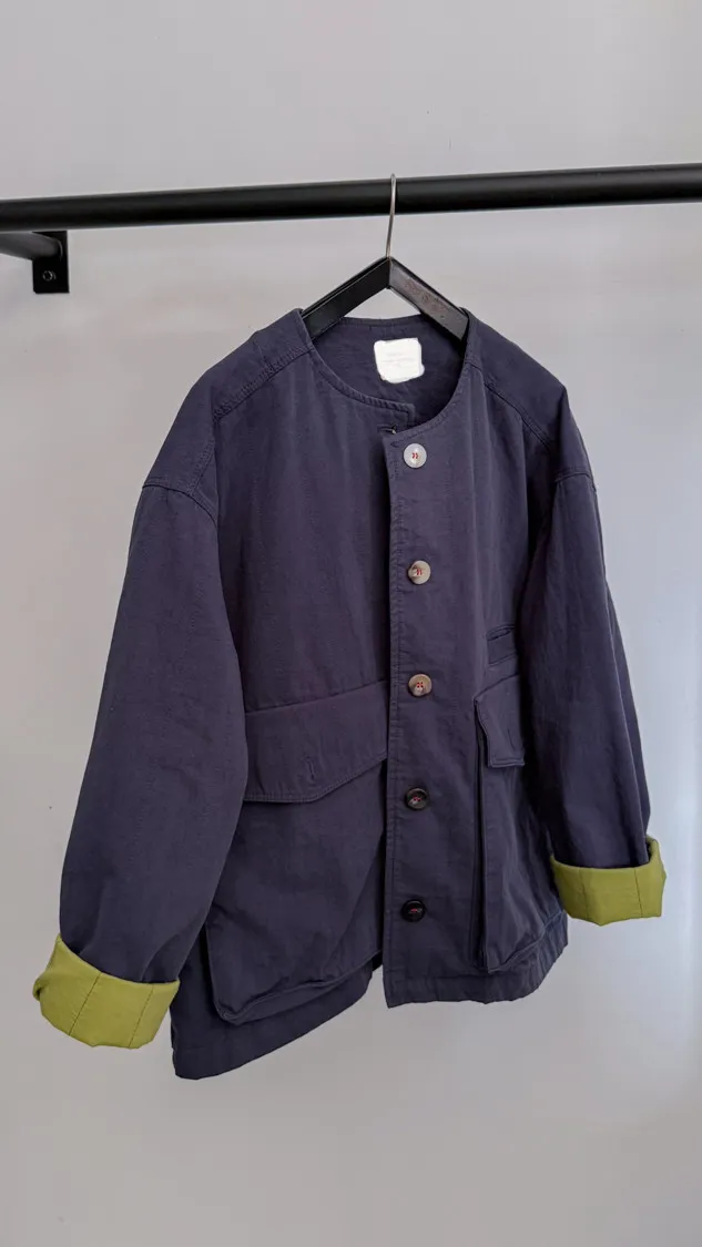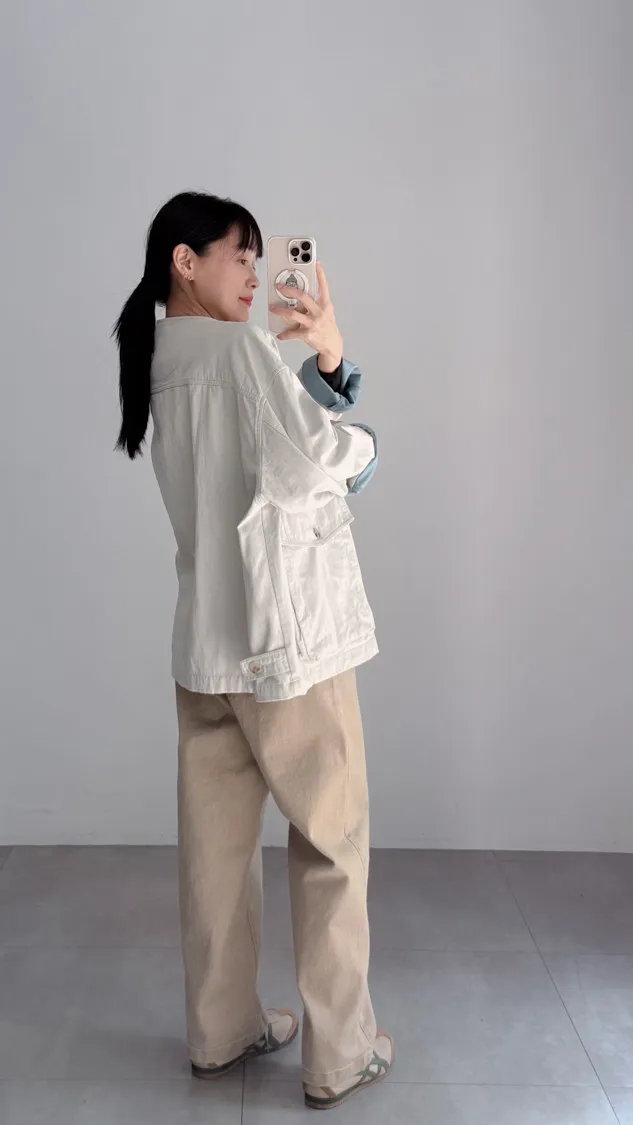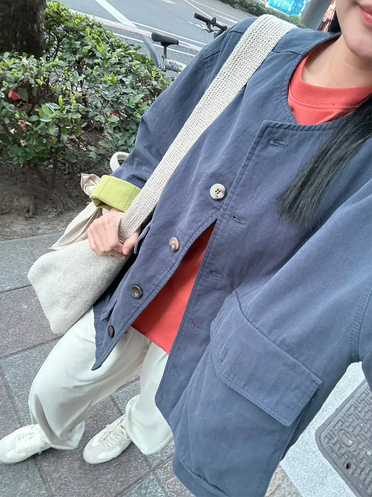 [特點] 無領外套設計,布面直線車縫細節,增加立體紋理,棉感布料,微寬鬆剪裁,內裡異色拼接,雙口大口袋設計。