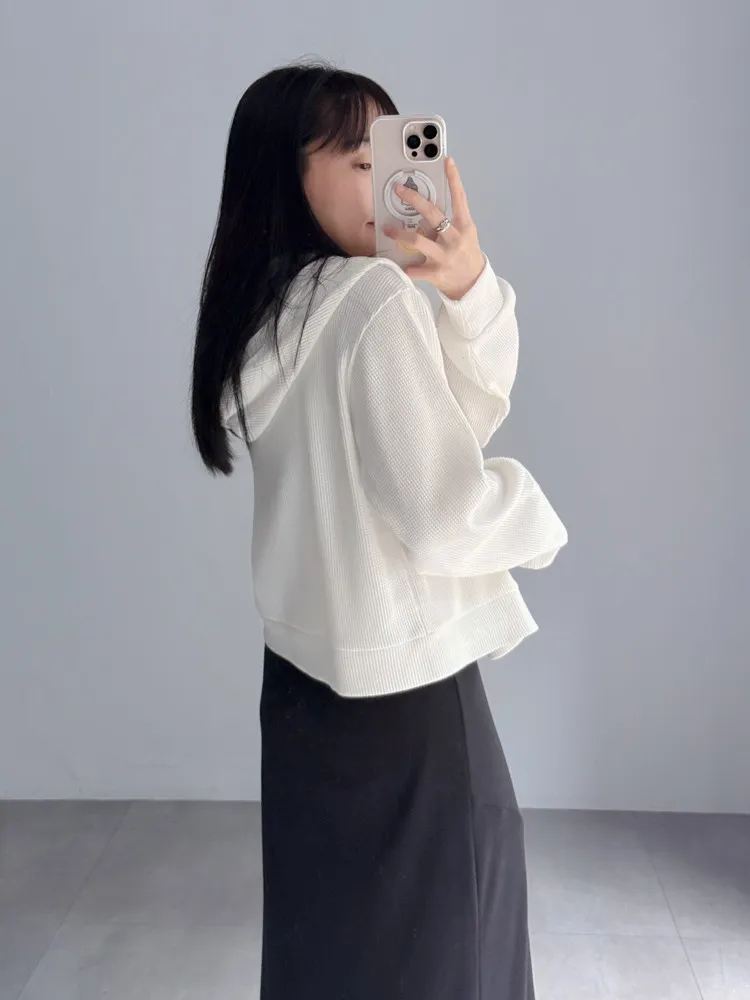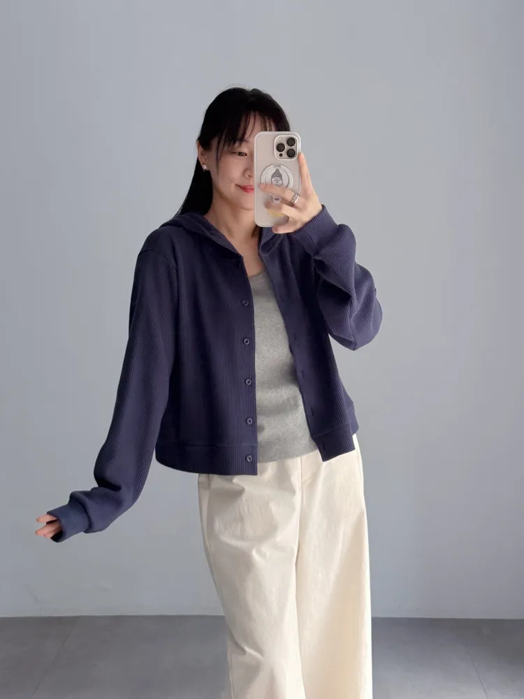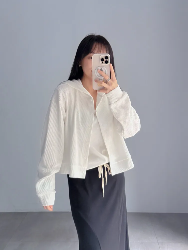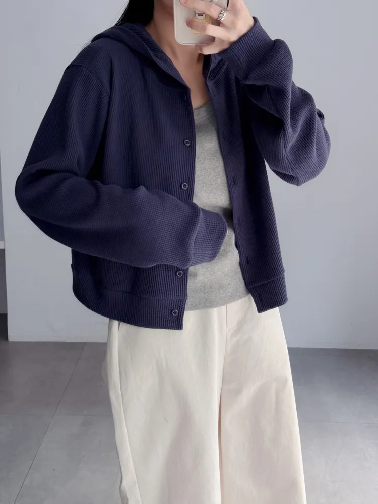 [特點] 立體織紋針織布,微寬鬆短版剪裁,連帽排扣設計。