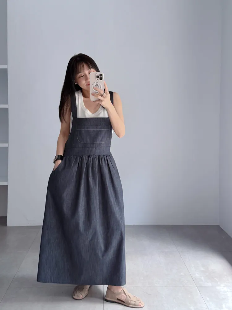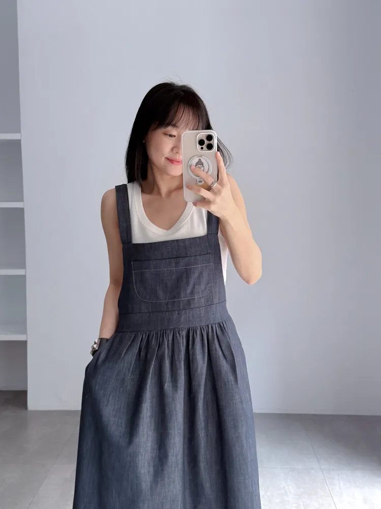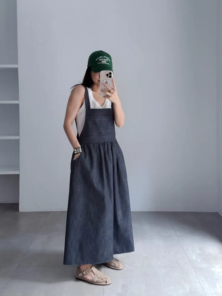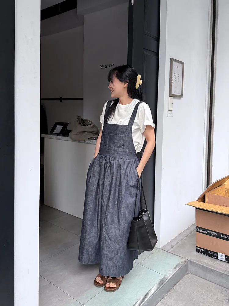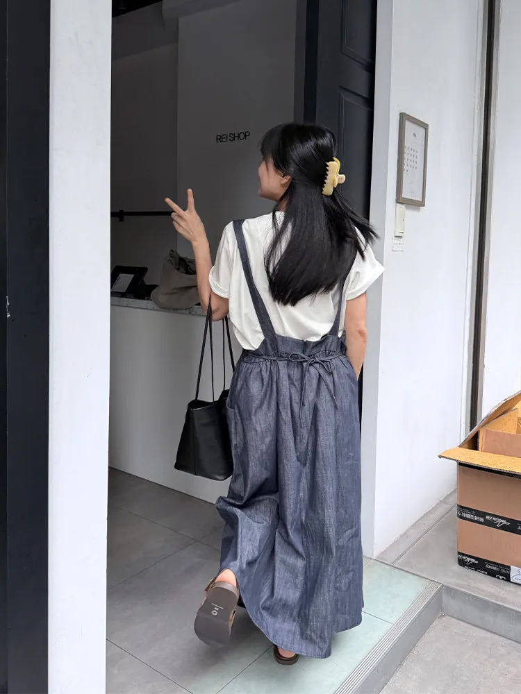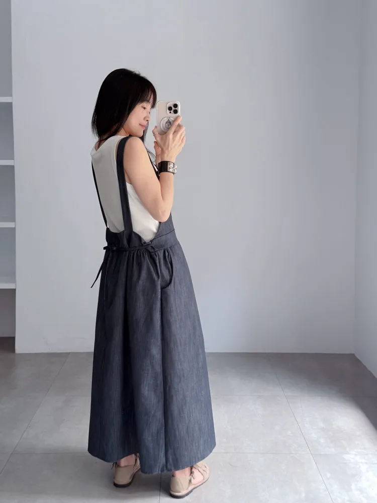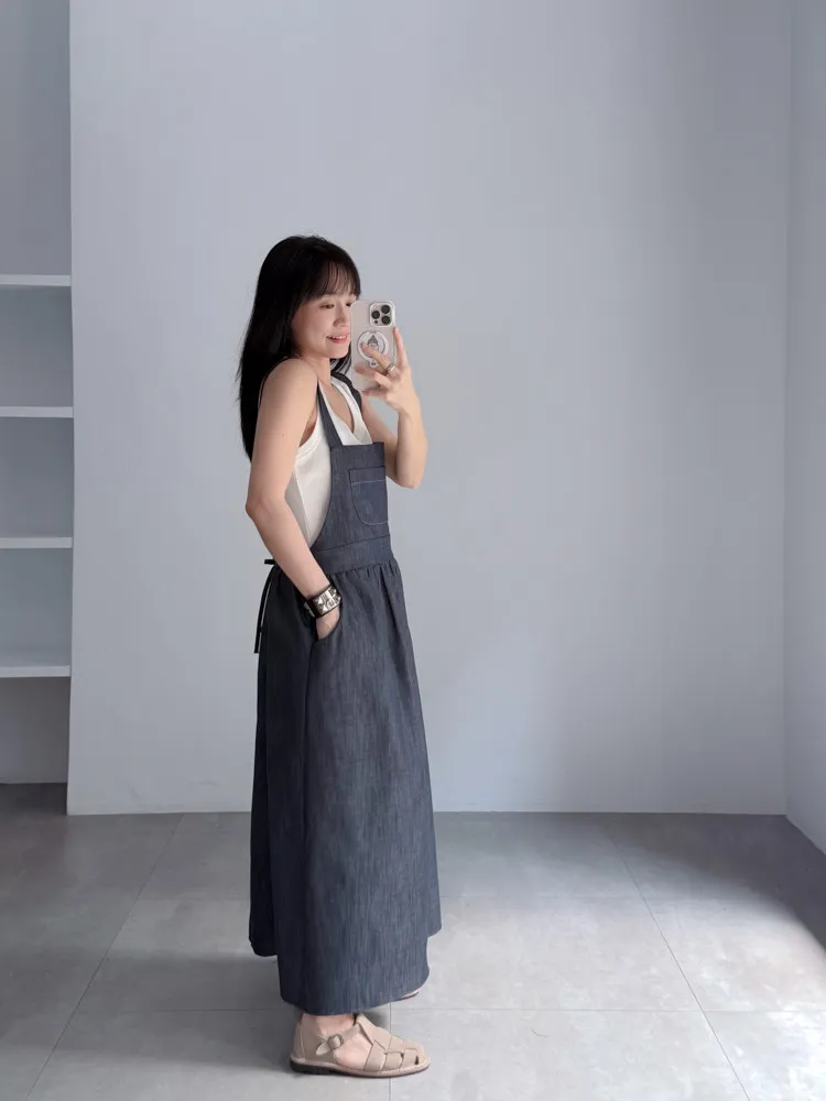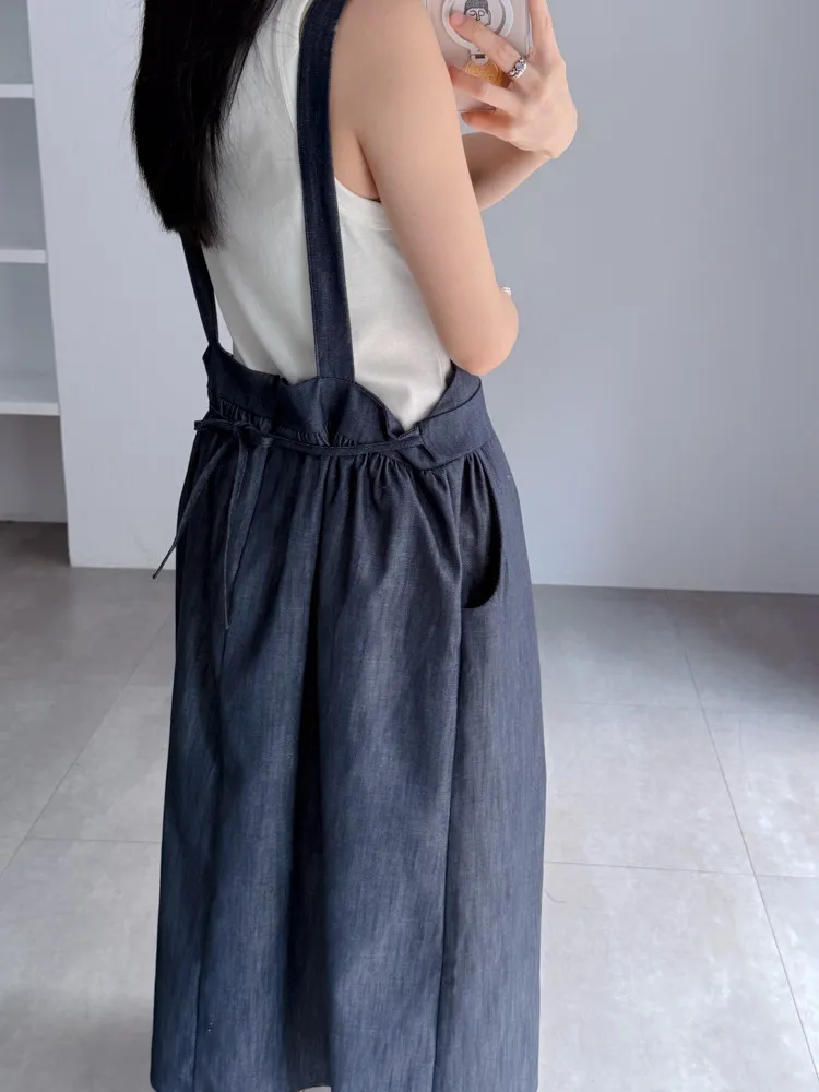 [特點] 丹寧面料,立體大口袋造型,腰下抓褶裙身,有內裡設計,兩側綁帶可以隨意綁帶(不可調鬆緊),後拉鍊設計穿脫。