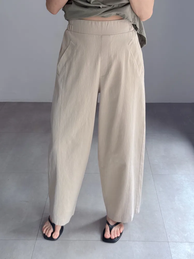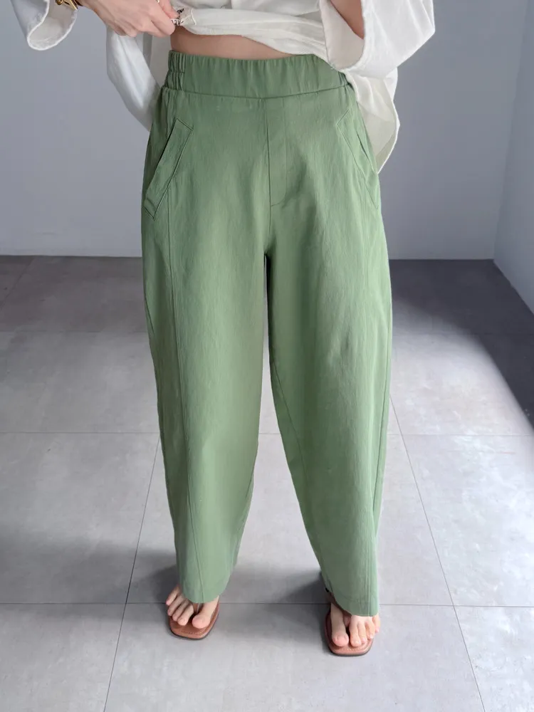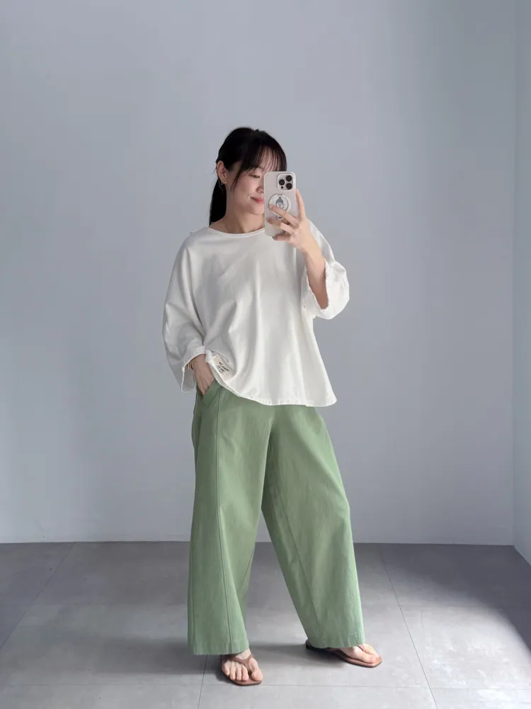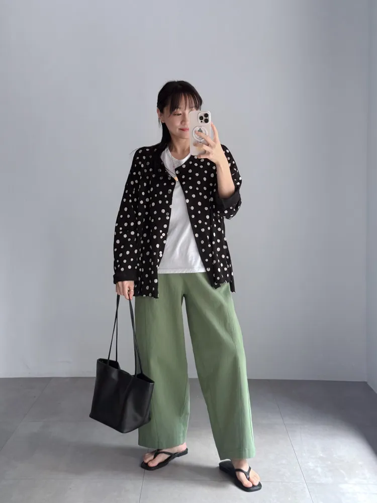 [特點] 布料厚薄適中,帶點挺度不軟塌的面料,布料有彈性,鬆緊彈性腰圍,版型修飾。