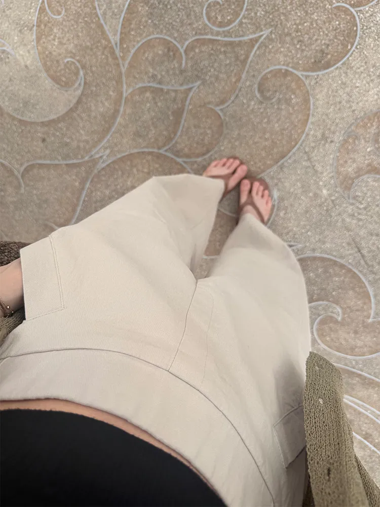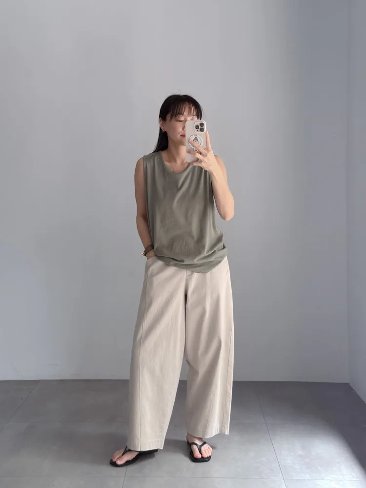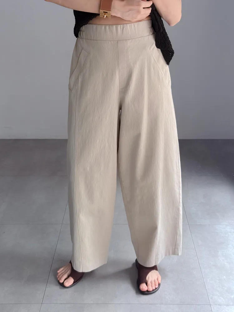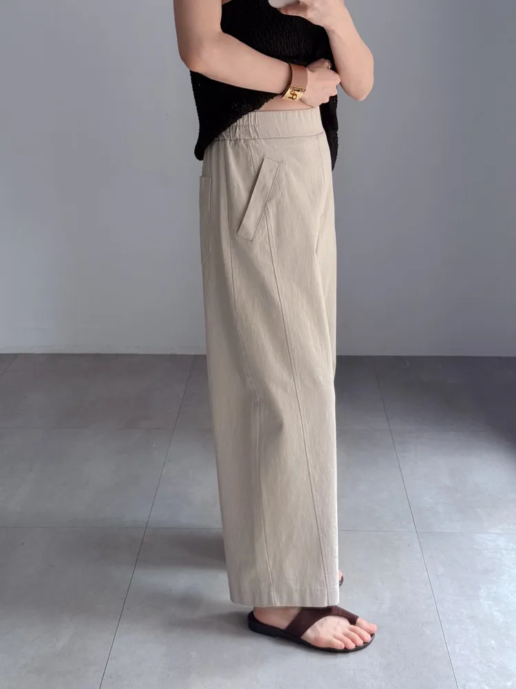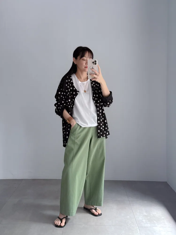 [特點] 布料厚薄適中,帶點挺度不軟塌的面料,布料有彈性,鬆緊彈性腰圍,版型修飾。