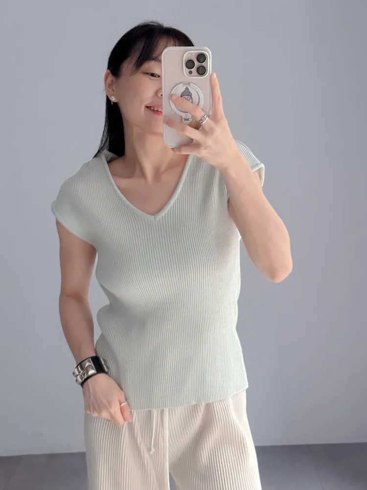 [特點] 細羅紋針織,具彈性與修飾效果,V領設計,修飾頸部與臉型比例,微包袖剪裁,布料柔軟親膚。