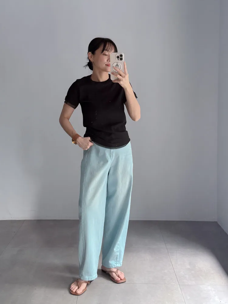 [特點] 斜紋軟綿料,面料有彈性,後鬆緊彈力腰圍,水藍帶刷白刷色,微微彎刀剪裁。