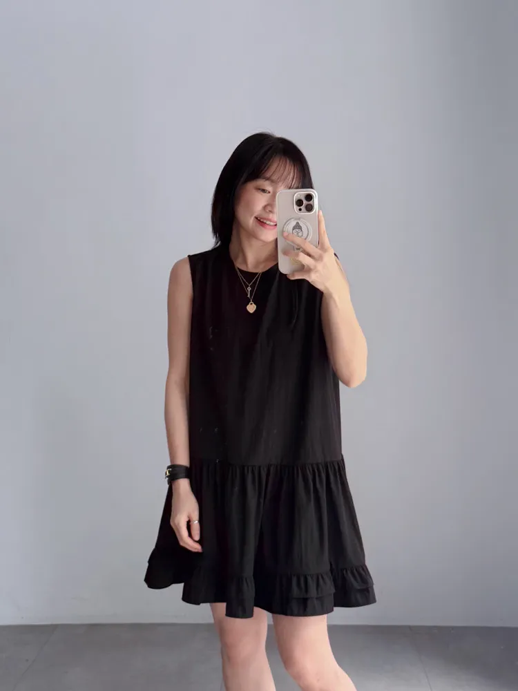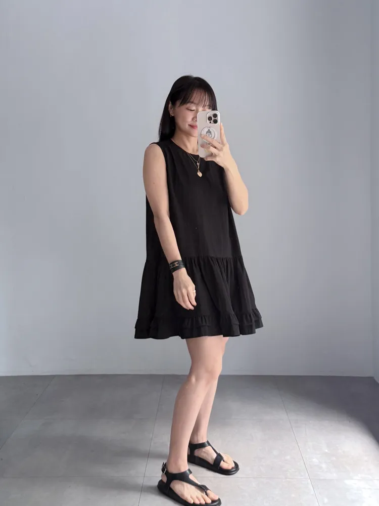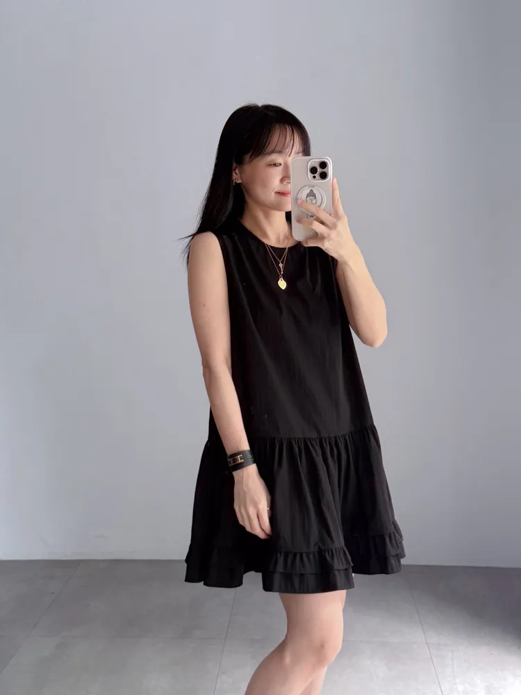 [特點] 後拉鍊穿脫設計,無袖剪裁,下擺拼接蛋糕層次、自然澎度,傘狀版型,布料輕盈。