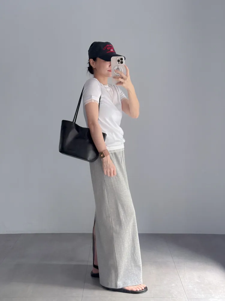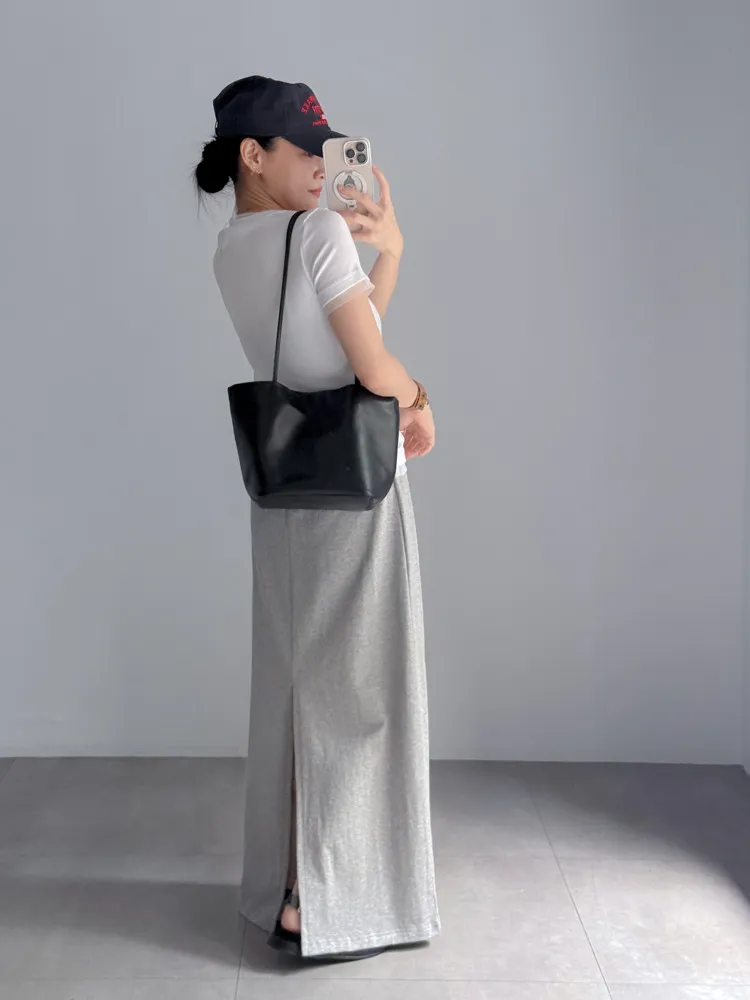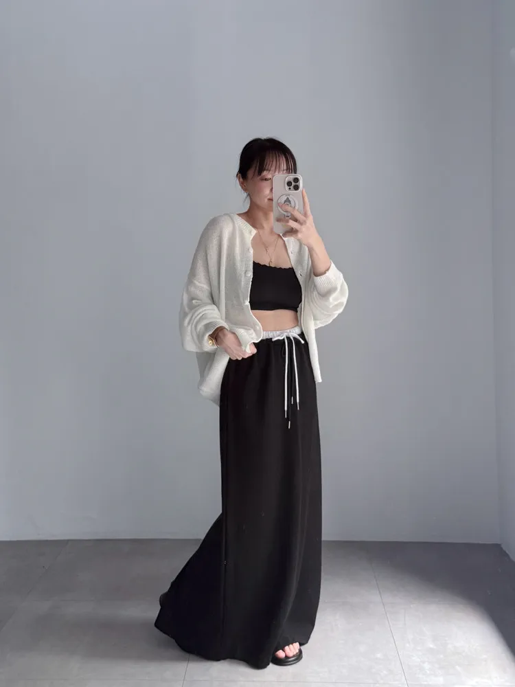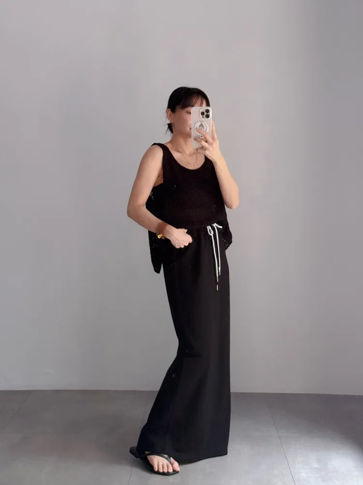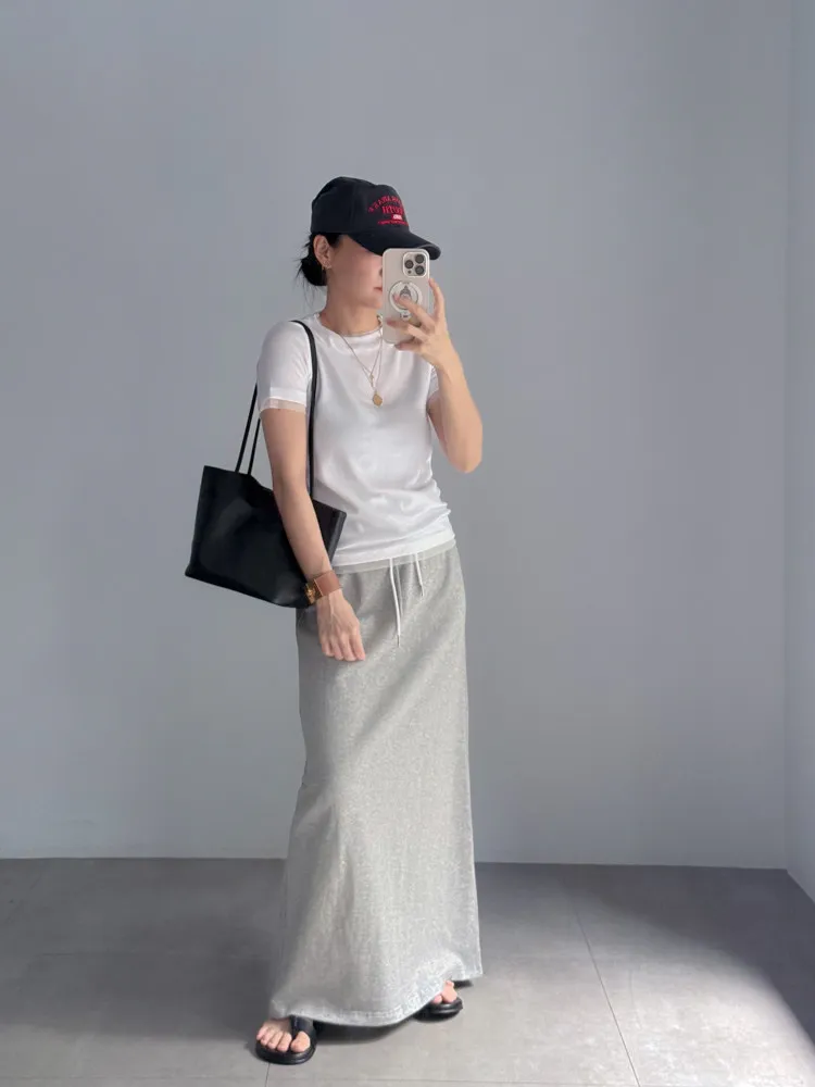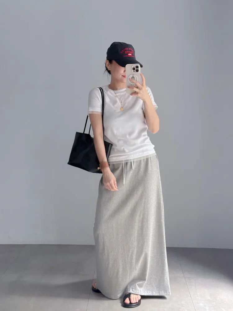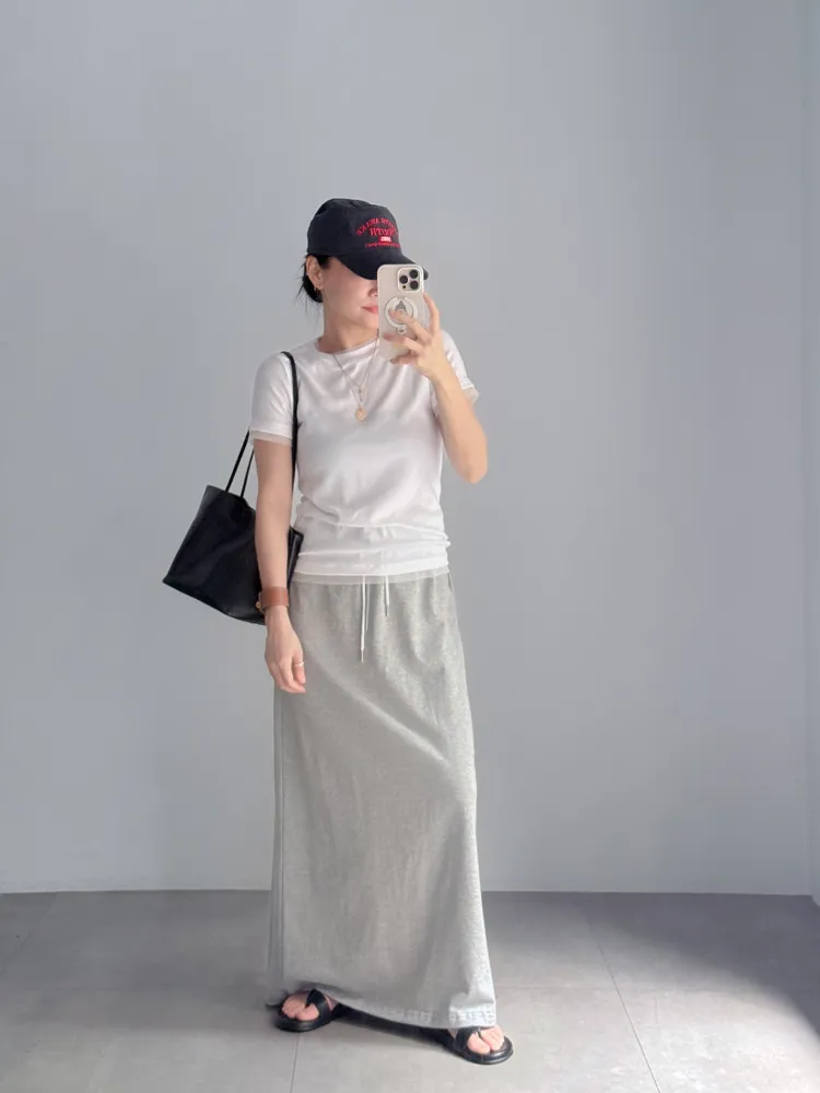[特點] 整圈鬆緊彈性+抽繩設計,雙層腰頭造型,軟料舒適棉質,直筒長裙版型。