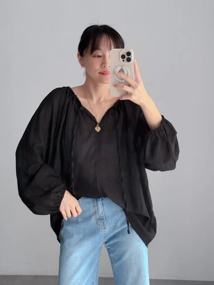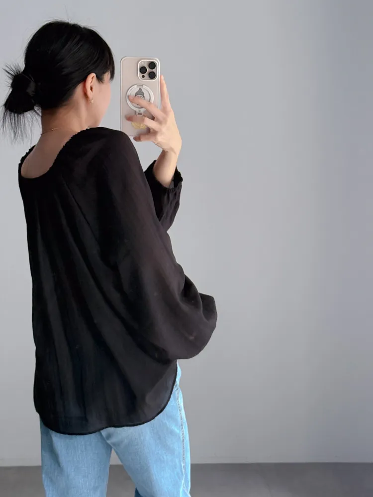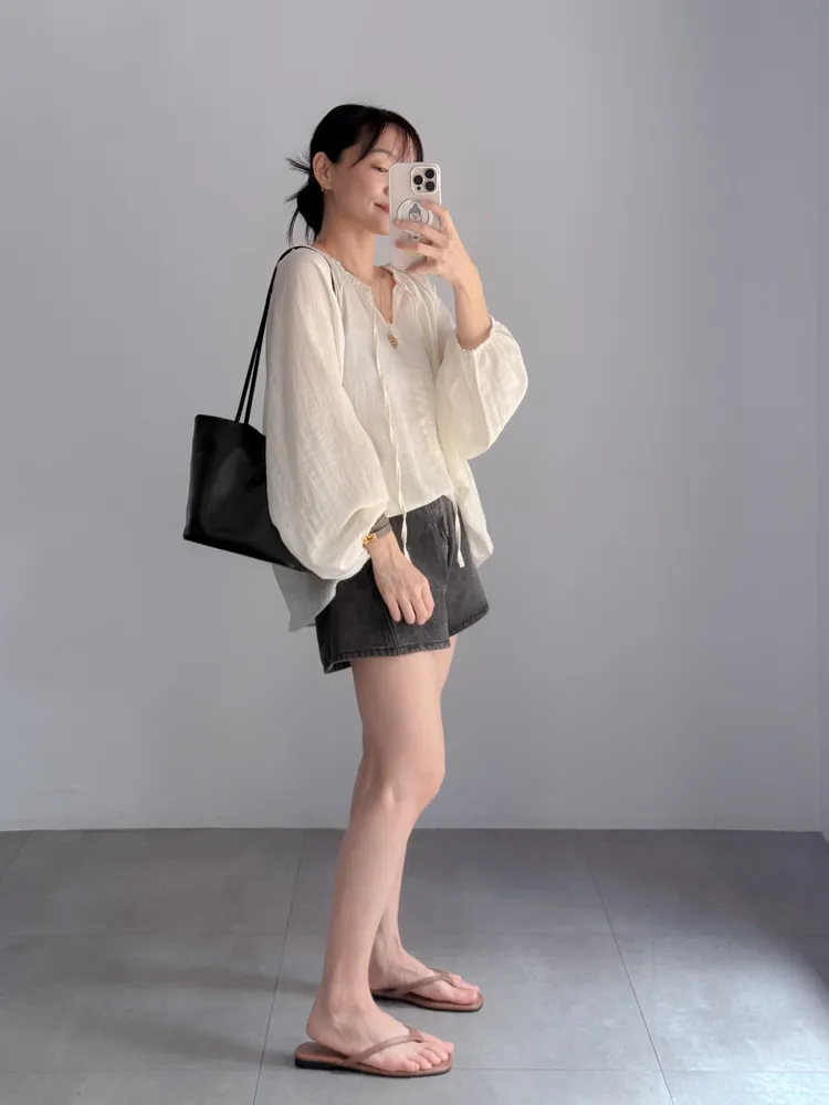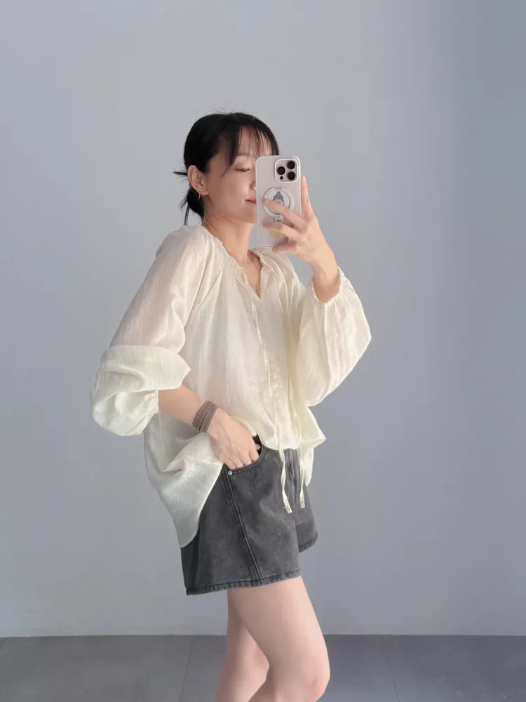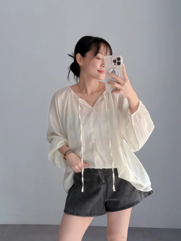 [特點] 自然透膚織紋,輕薄透氣不易皺,前綁帶設計,後領口處鬆緊彈力,澎袖剪裁,袖口鬆緊設計。