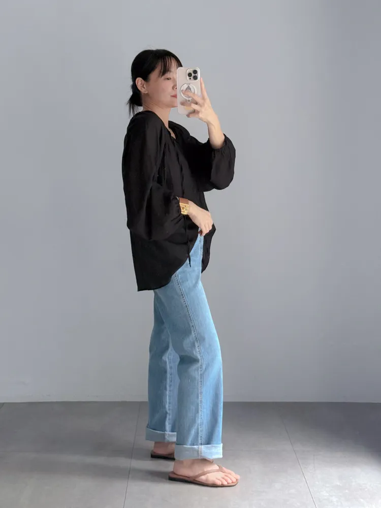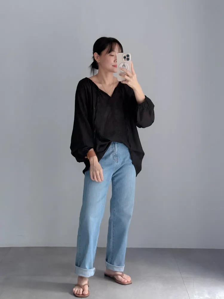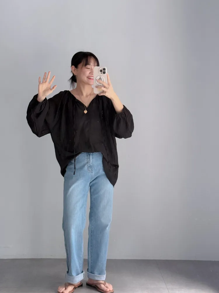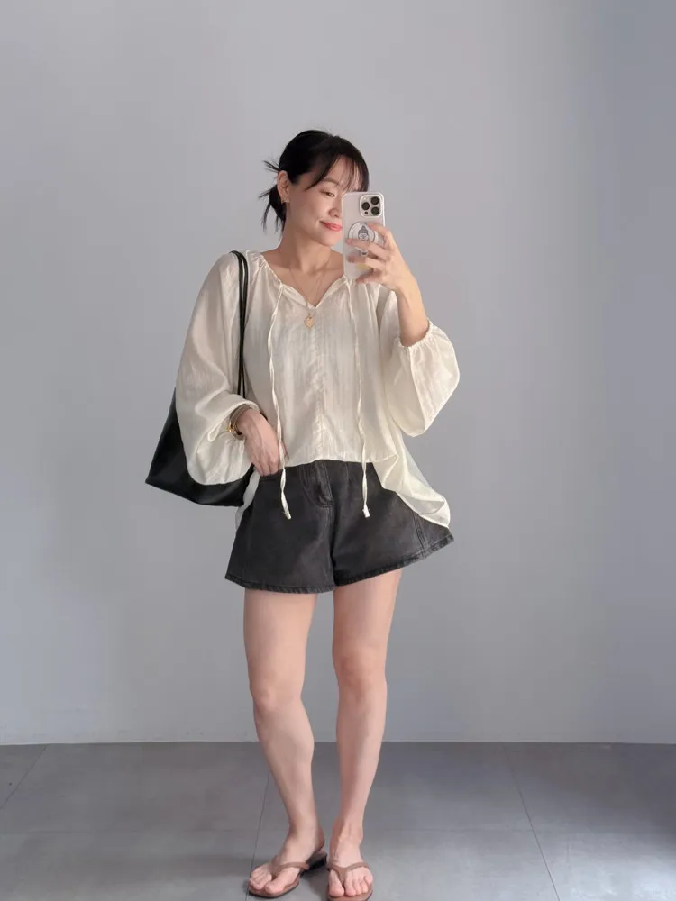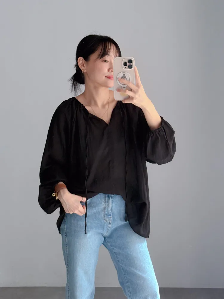 [特點] 自然透膚織紋,輕薄透氣不易皺,前綁帶設計,後領口處鬆緊彈力,澎袖剪裁,袖口鬆緊設計。